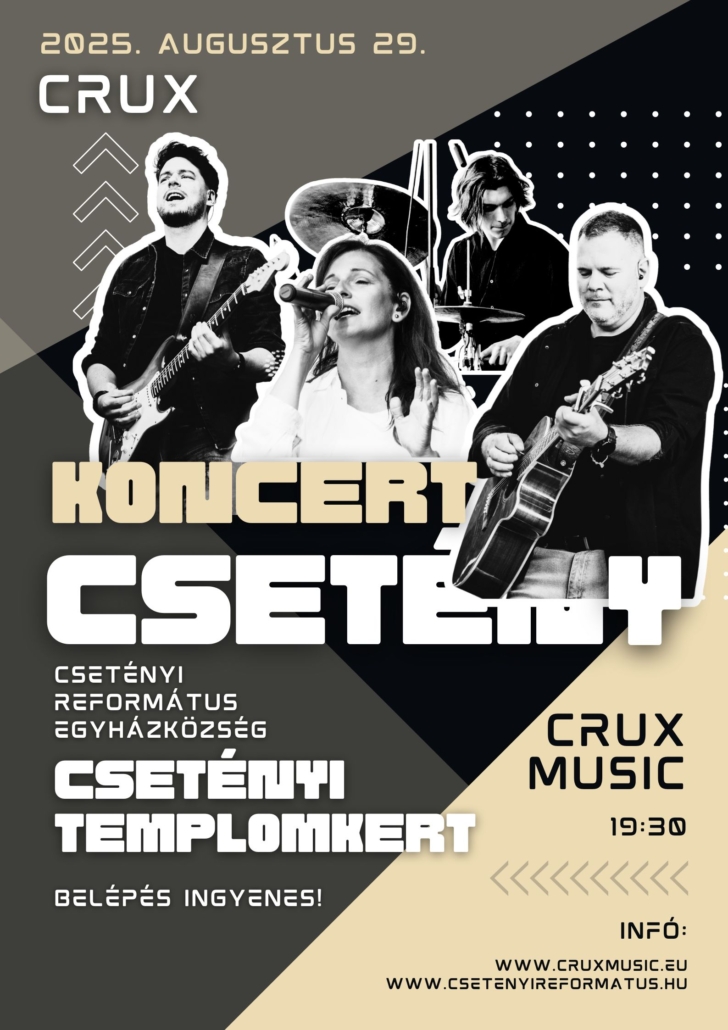 /Kategória: Gyülekezeti hírek, HirdetményekA Csetényi Református Egyházközség küldetésének tekinti, hogy ne csak saját közösségében, hanem azon kívül is hirdesse az evangéliumot az Istent dicsőítő zenén keresztül. A Vallásos könnyűzenei támogatás 2024. program keretében a CRUX zenekarral együttműködésben öt keresztény könnyűzenei koncertestet valósítottunk meg, a Dicsőítő Felvidék rendezvénysorozat részeként.